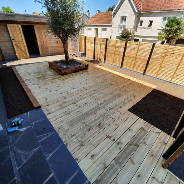 Réalisé en bois, en composite ou bien en dallage, la terrasse est une pièce supplémentaire de votre maison dès les beaux jours arrivés. La terrasse, élément indispensable pour profiter encore plus de votre jardin tout simplement pour boire un pot entre amis ou en famille, profiter des rayons du soleil et pourquoi pas en profiter pour y faire un barbecue. La terrasse peut être décorées et aménagé comme les autres pièces de la maison à l'aide de mobilier, de végétaux en pots et de jeux de lumières permettant de prolonger vos soirées d'été.